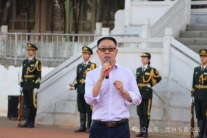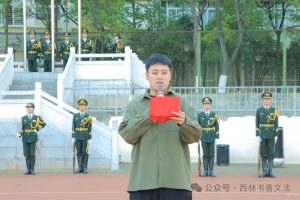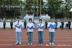 员工代表李福鑫、郭宇飞、王垚、赵卿惠在国旗下朗诵习近平总书记致云南大学建校100周年的贺信。四名同学慷慨激昂、声情并茂,号召同学们牢记习近平总书记殷殷嘱托,坚持总体国家安全观,维护国家安全,在新征程上书写新的华章。