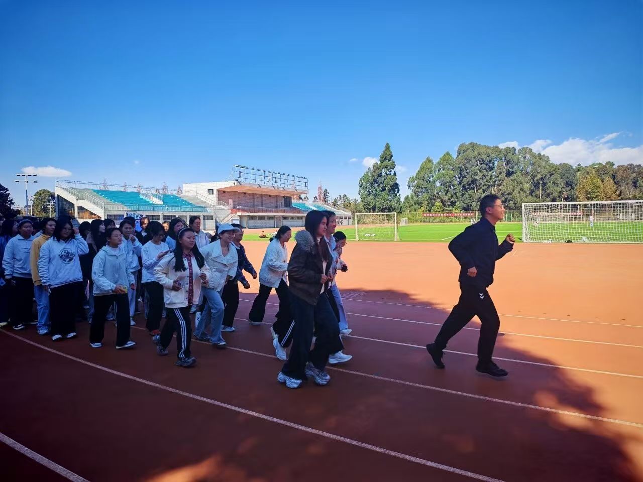 活动过程中,师生们个个精神饱满、斗志昂扬、步伐矫健,沿着预先设定的路线奋力奔跑。跑道上,他们相互鼓劲、并肩前行,陌生的距离在脚步声中悄然消融,在互动交流中增进情谊,青春的活力与团结的力量尽情绽放。整个运动场上充满了欢声笑语与蓬勃朝气,充分彰显了文法学子的精神风貌。